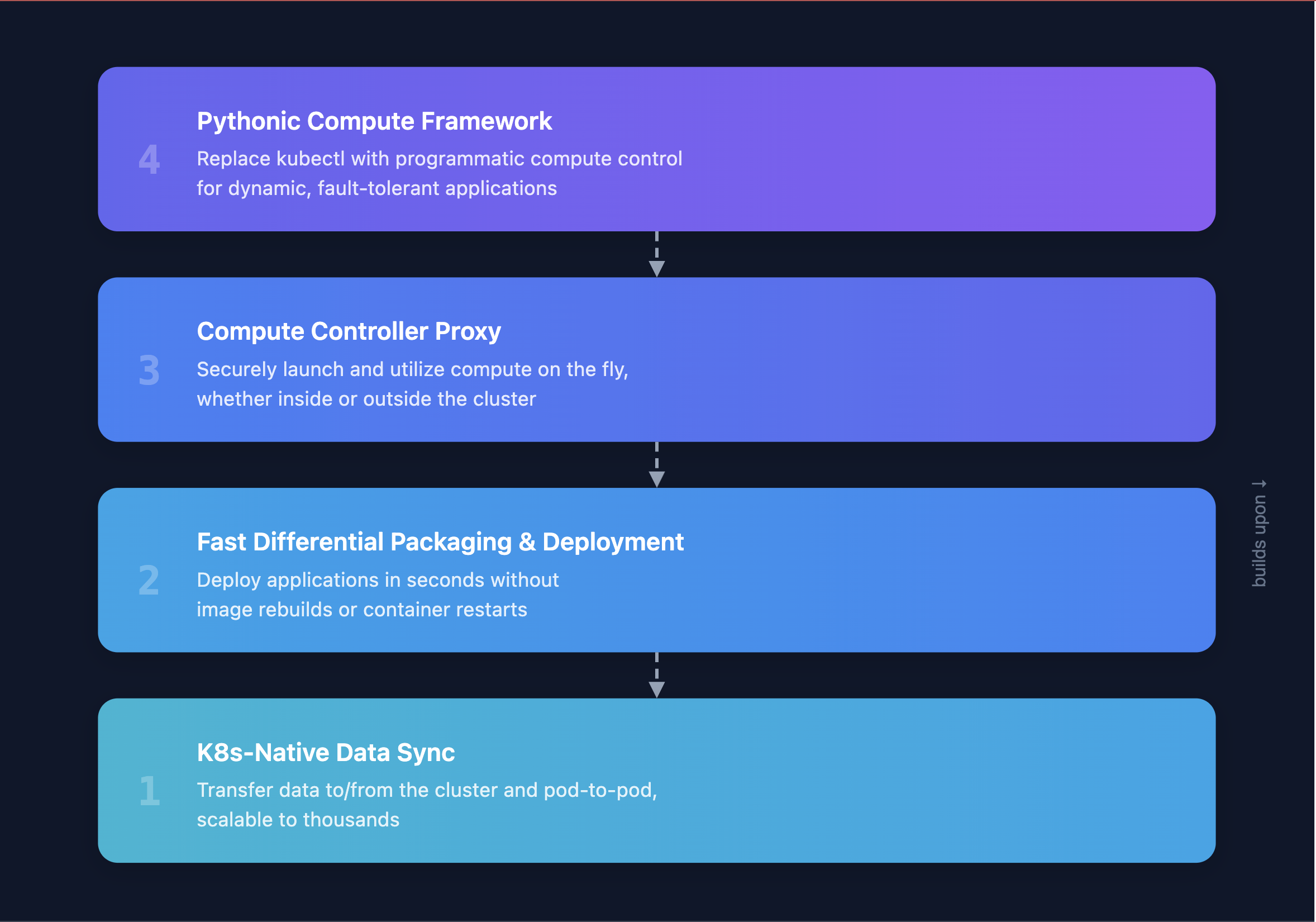 Kubetorch is built as four layers, each solving one of the problems above. The layers build upon one another but can be used independently: