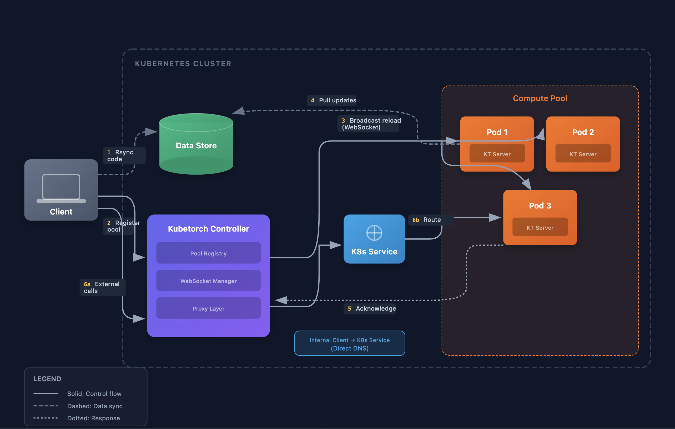 This section describes how Kubetorch's components interact at runtime. Understanding this flow is helpful for debugging, platform integration, and advanced customization.